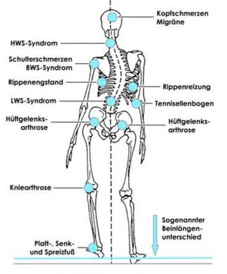 Das Becken ist das Zentrum unseres Körpers. Ist das Iliosakralgelenk (ISG) blockiert und die Beckenachse verschoben, entsteht ein Beinlängenunterschied. Im Gesamten Körper kommen die Gelenke in Fehlstellung. Bänder und Sehnen sind überdehnt/verspannt und die Muskeln können nicht mehr in ein Gleichgewicht zurückkehren. Daraus entsteht eine Vielzahl von Beschwerden.